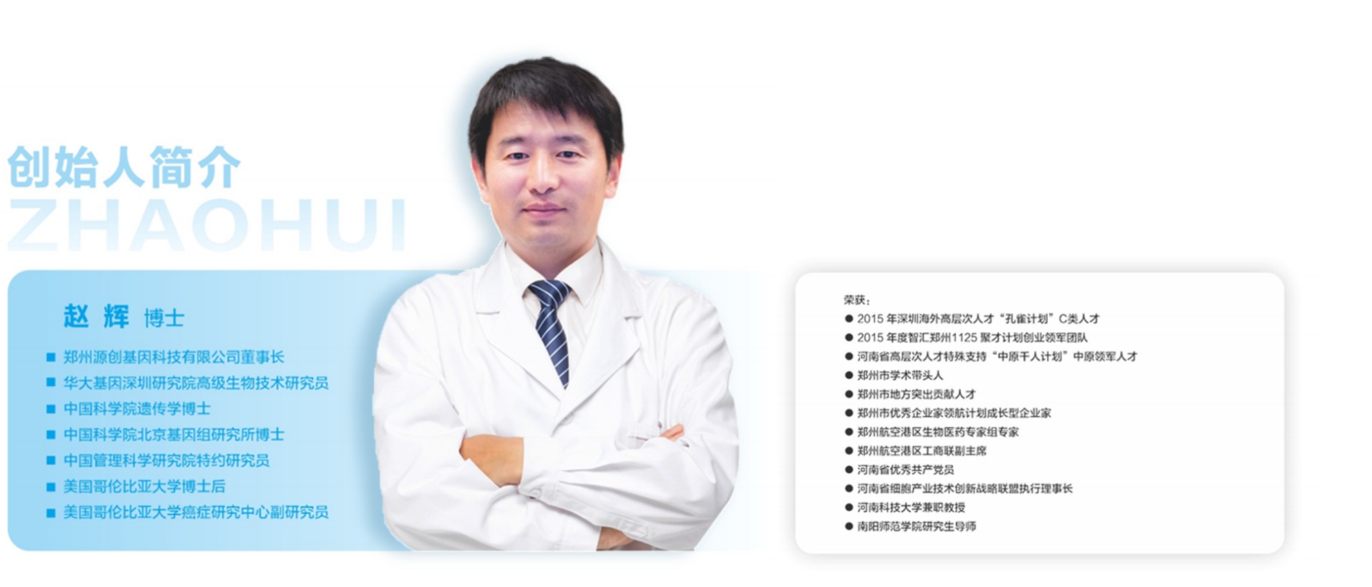 鄭州源創(chuàng)基因科技有限公司成立于2016年,由哥倫比亞大學(xué)博士后趙輝,歸國創(chuàng)辦的國家高新技術(shù)企業(yè)。擁有97項知識產(chǎn)權(quán)及實用技術(shù),業(yè)務(wù)遍布上海、重慶、深圳、北京等城市,總部在鄭州航空港區(qū)。