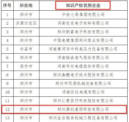 11月15日,河南省知識產(chǎn)權(quán)局公布了《2023年度河南省知識產(chǎn)權(quán)強企備案名單》,鄭州源創(chuàng)基因科技有限公司榮獲“河南省知識產(chǎn)權(quán)優(yōu)勢企業(yè)”稱號。