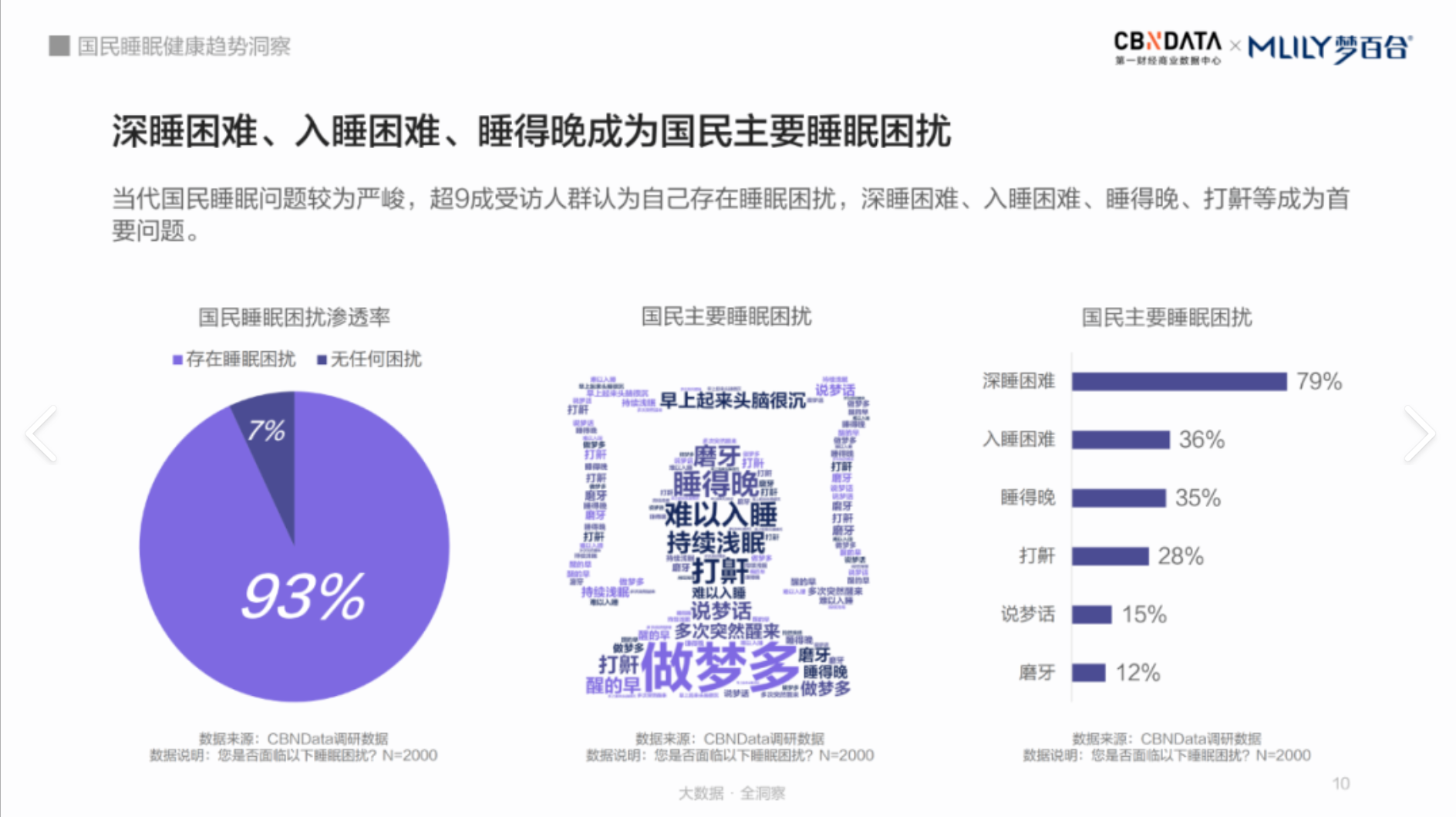 調(diào)查顯示,超過3億人口正面臨睡眠障礙問題,平均每10個(gè)人中就有1人受此影響。睡眠障礙中最常見的問題是睡眠不深、難以入睡和睡得晚。對年輕人來說,長期失眠不僅會影響白天的精神狀態(tài),還可能影響工作和生活效率。對于年長者來說,他們的困擾則更多集中在睡眠狀態(tài)本身,如難以深度睡眠、醒來后難以再次入睡、做夢多、打鼾等問題。