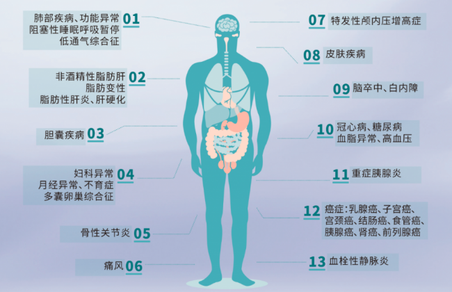 2020年底發(fā)布的《中國居民營養(yǎng)與慢性病狀況報告(2020)》發(fā)布會提供的數(shù)據(jù)顯示,我國成年居民超重、肥胖超過50%。肥胖是發(fā)生代謝性疾病的關鍵風險因素,其患病率在全球范圍內(nèi)呈上升趨勢。我國人群相關的大型前瞻性研究數(shù)據(jù)顯示,超重和肥胖與高血壓、高血脂、2型糖尿病、冠心病、腦卒中和多種腫瘤等的風險增高相關。