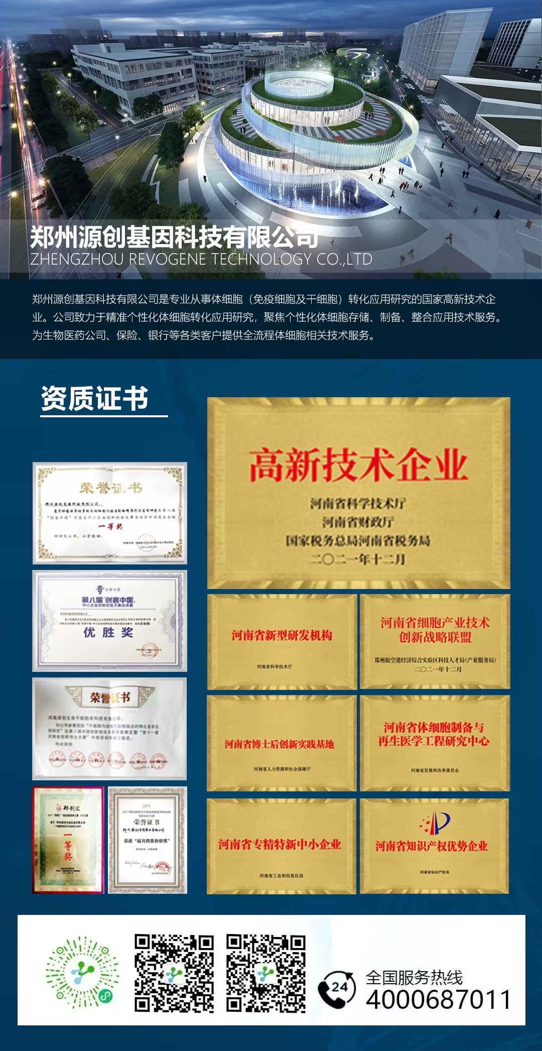 鄭州源創基因科技有限公司成立于2016年,由哥倫比亞大學博士后趙輝,歸國創辦的國家高新技術企業。擁有97項知識產權及實用技術,業務遍布上海、重慶、深圳、北京等城市,總部在鄭州航空港區。