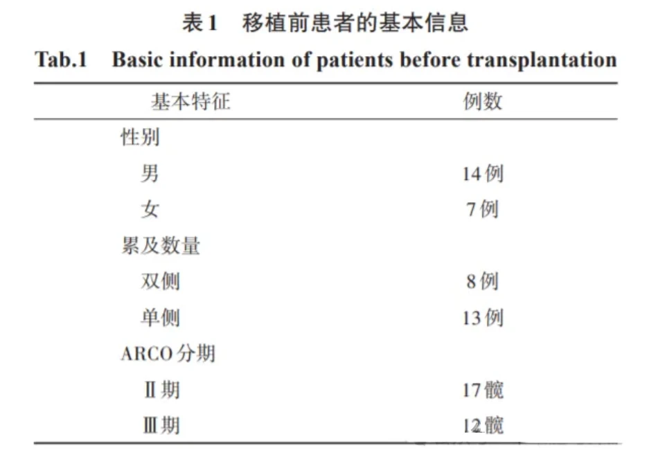 臨床研究人員選擇2017年1月—2019年9月在徐州醫科大學附屬醫院收治的股骨頭壞死接受人臍間充質干細胞治療的患者21例,男14例,女7例,共29個髖關節(髖)。