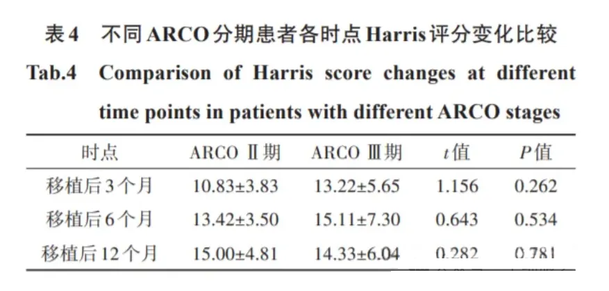 Harris評分:移植前(62.76±10.08)分,移植后3個月(74.62±9.70)分、6個月(76.90±8.21)分和 12個月(77.48±7.54)分,均較術前明顯提高(P<0.05)。股骨頭壞死面積:移植后 12個月平均(187.27±11.01)mm2 ,較移植前(236.31±23.43)mm2 明顯縮小(P<0.05)。