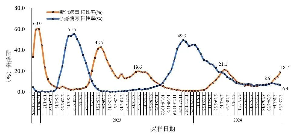 2024年8月8日,中疾控官網發布7月份《全國新型冠狀病毒感染疫情情況》,報告顯示,流感樣病例新冠病毒陽性率從第27周(7月1日-7月7日)的8.9%持續上升至第30周(7月22日-7月28日)的18.7%。新型冠狀病毒感染人數有上升,占比升高。主要流行株均為奧密克戎變異株,我國主要以JN.1系列變異株和XDV系列變異株為主。