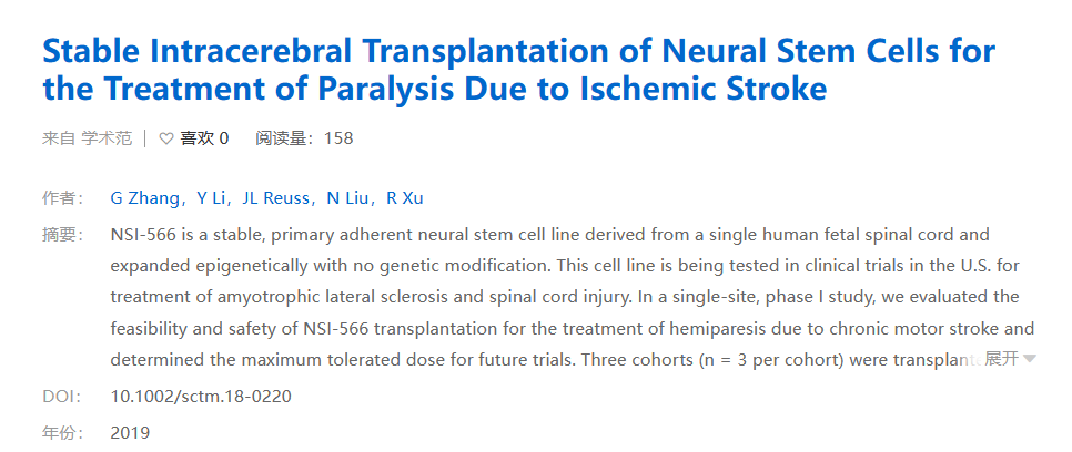 神經干細胞腦內移植治療缺血性腦卒中:2019年,我國解放軍總醫(yī)院的研究團隊發(fā)表了關于神經干細胞腦內移植治療的研究,該研究使用的NSI-566原代貼壁神經干細胞系,來源于人類胎兒脊髓,未進行基因修飾。研究結果顯示,所有受試者在接受腦內注射不同密度干細胞后,腦部都有新神經組織形成來填充空腔,且運動功能得到一定改善。