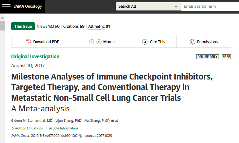 美國食品藥品監(jiān)督管理局藥物評價和研究中心的團隊在行業(yè)期刊JAMA Oncol上發(fā)表了題為Milestone Analyses of Immune Checkpoint Inhibitors, Targeted Therapy, andConventional Therapy in Metastatic Non-Small Cell Lung Cancer Trials A Meta-analysis的綜述報告。