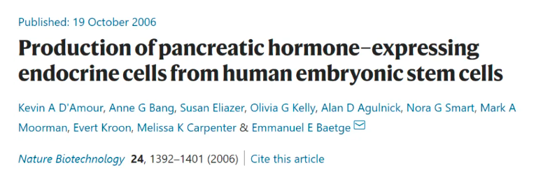 2006年,Novocell公司(現(xiàn)名Viacyte)的研究團(tuán)隊(duì)在Nature Biotechnology上發(fā)表論文,描述了將人類胚胎干細(xì)胞分化成為能夠分泌胰島素、胰高血素等多種激素的內(nèi)分泌胰島細(xì)胞的過(guò)程。