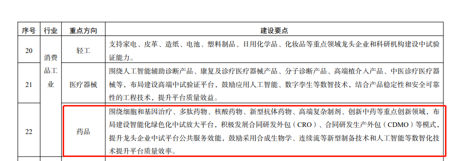 《制造業中試平臺建設指引(2024年版)》明確指出,針對醫藥等質量安全標準嚴苛的行業,將加速推進智能化、綠色化的中試放大平臺建設,同時積極推廣合同研發外包(CRO)與合同研發生產外包(CDMO)等合作模式,旨在增強行業領軍企業中試平臺的公共服務能力,并為初創企業降低進入門檻。