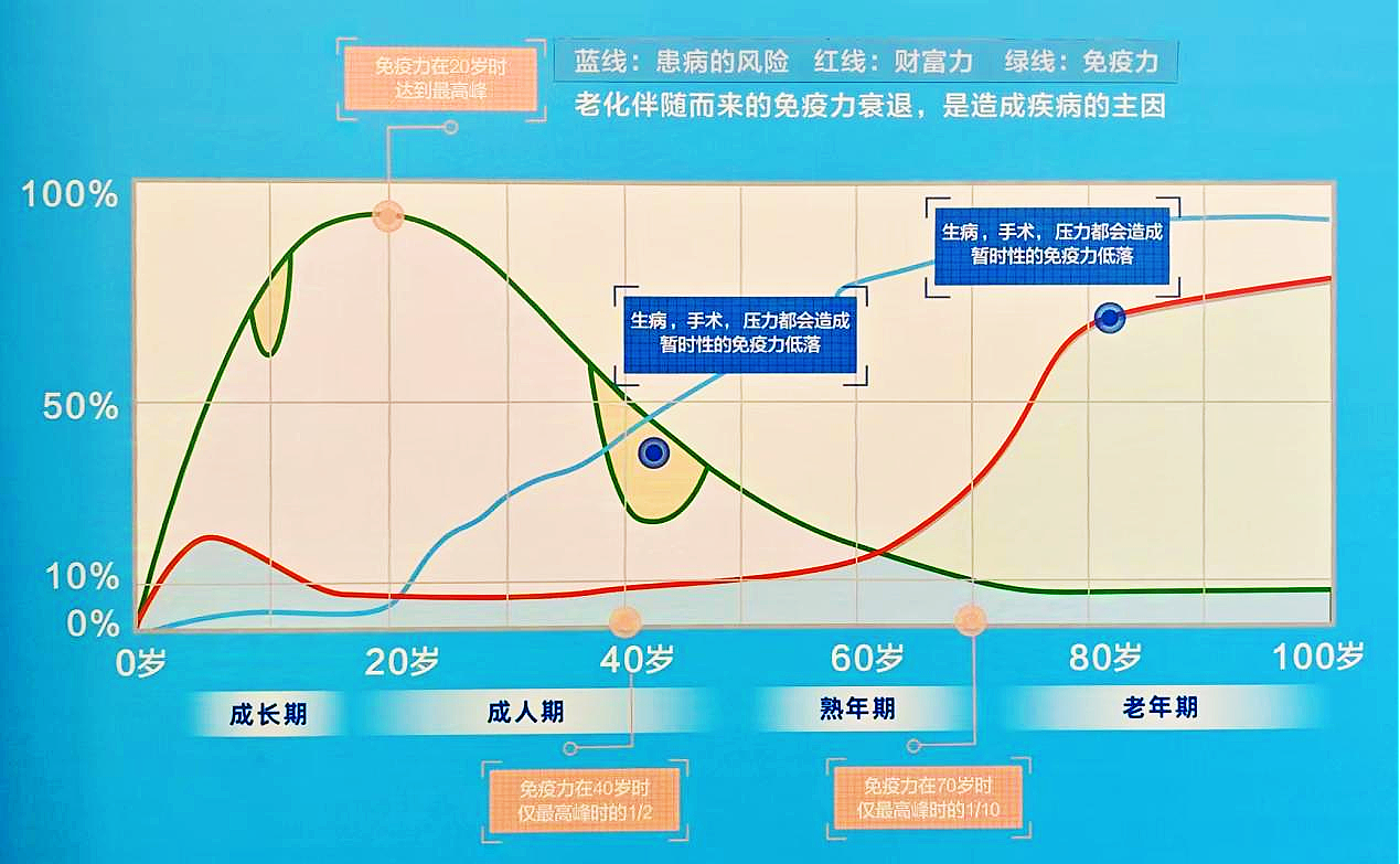 然而,隨著年齡的增長,這些免疫指標開始下降,到了60至70歲,免疫細胞的數量可能降至最高點時的十分之一,免疫力明顯衰退。