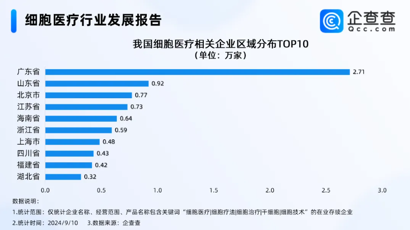 企業存量方面,我國現存11.4萬家細胞醫療相關企業,其中23.8%的企業來自廣東。廣東現存2.7萬家細胞醫療相關企業,是存量第二區域山東的2.9倍。