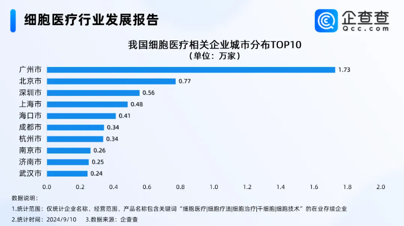 城市分布上,廣州現存細胞醫療相關企業最多,有1.73萬家,占廣東總存量的比重超六成。北京、深圳分別現存0.77萬家、0.56萬家細胞醫療相關企業,排名第二和第三,此后依次為上海、海口、成都等地,相關企業存量均在5000家以內。