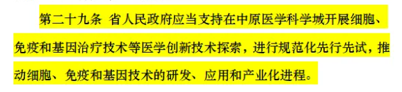 條例第二十九條明確提出:省人民政府應(yīng)當支持在中原醫(yī)學(xué)科學(xué)城開展細胞、免疫和基因治療技術(shù)等醫(yī)學(xué)創(chuàng)新技術(shù)探索,進行規(guī)范化先行先試,推動細胞、免疫和基因技術(shù)的研發(fā)、應(yīng)用和產(chǎn)業(yè)化進程。