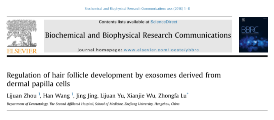 2018年,來自浙江大學醫學院附屬第二醫院皮膚科的研究團隊在國際學術期刊Biochemical and Biophysical Research Communications發表了題為《Regulation of hair follicle development by exosomes derived from dermal papilla cells(來自真皮乳頭細胞的外泌體對毛囊發育的調節)》,研究結果顯示外泌體能夠加速毛囊生長期和延緩退行期。