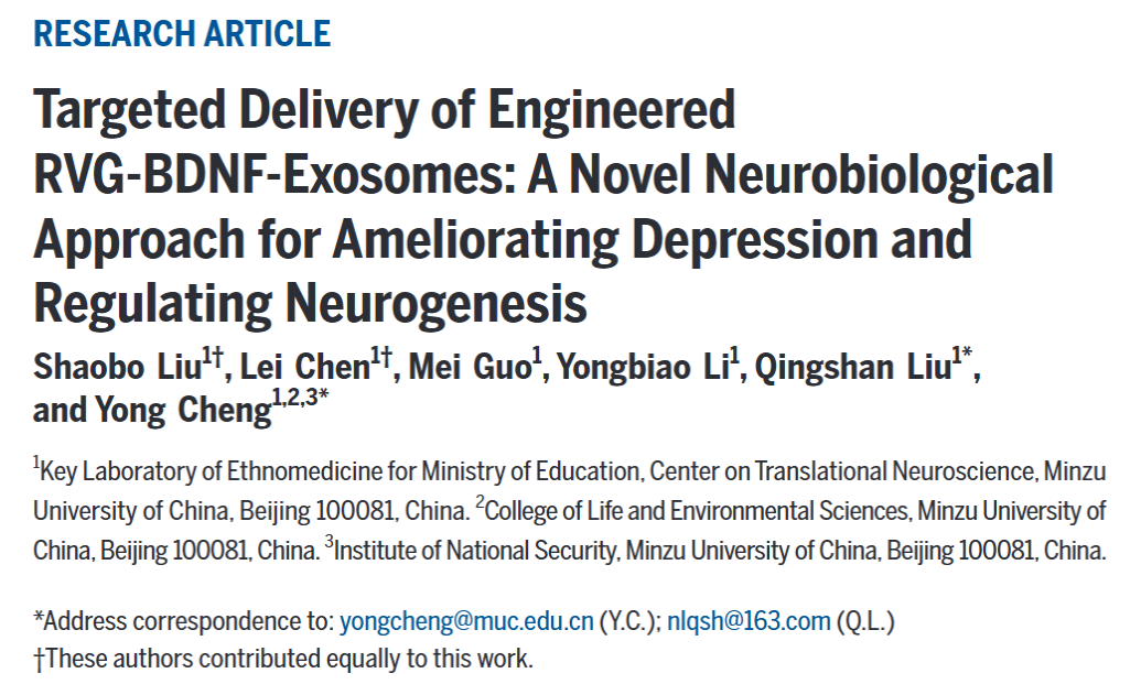 國內外的研究表明,外泌體在治療腦部疾病,如帕金森病、阿爾茨海默病、腦卒中、抑郁癥等方面具有潛在作用。中央民族大學程勇教授團隊在《Research》雜志上發表的研究論文“Targeted Delivery of Engineered RVG-BDNF-Exosomes: A Novel Neurobiological Approach for Ameliorating Depression and Regulating Neurogenesis”介紹了一種新型靶向神經元的工程化外泌體結合基因治療技術,該技術減輕了腦部炎癥,顯著改善了小鼠的抑郁癥狀,為腦部疾病的治療提供了新策略和方向。