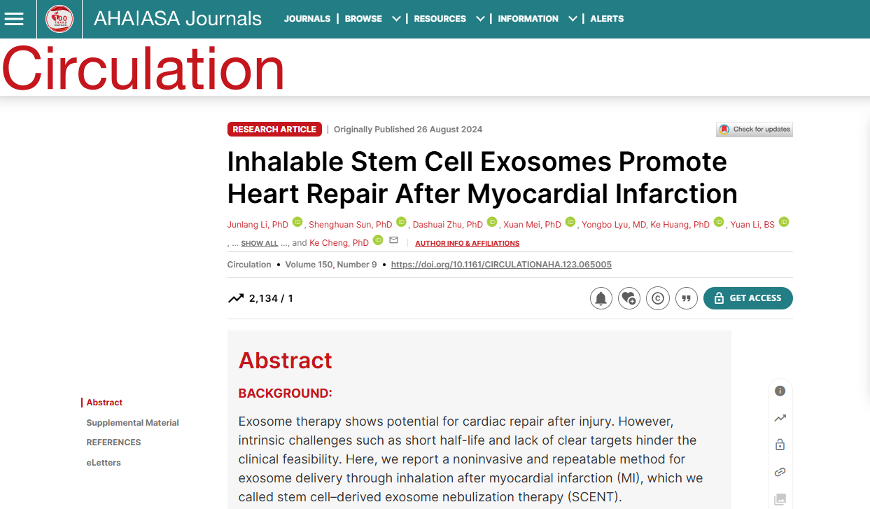 最新的研究發(fā)現(xiàn),外泌體在心臟損傷修復(fù)中顯示出巨大潛力。一項(xiàng)發(fā)表在《Circulation》雜志上的研究介紹了一種名為Stem Cell-derived Exosome Nebulization Therapy(干細(xì)胞外泌體霧化療法,簡稱SCENT)的無創(chuàng)性外泌體遞送方法,通過霧化吸入治療梗死后的心臟。