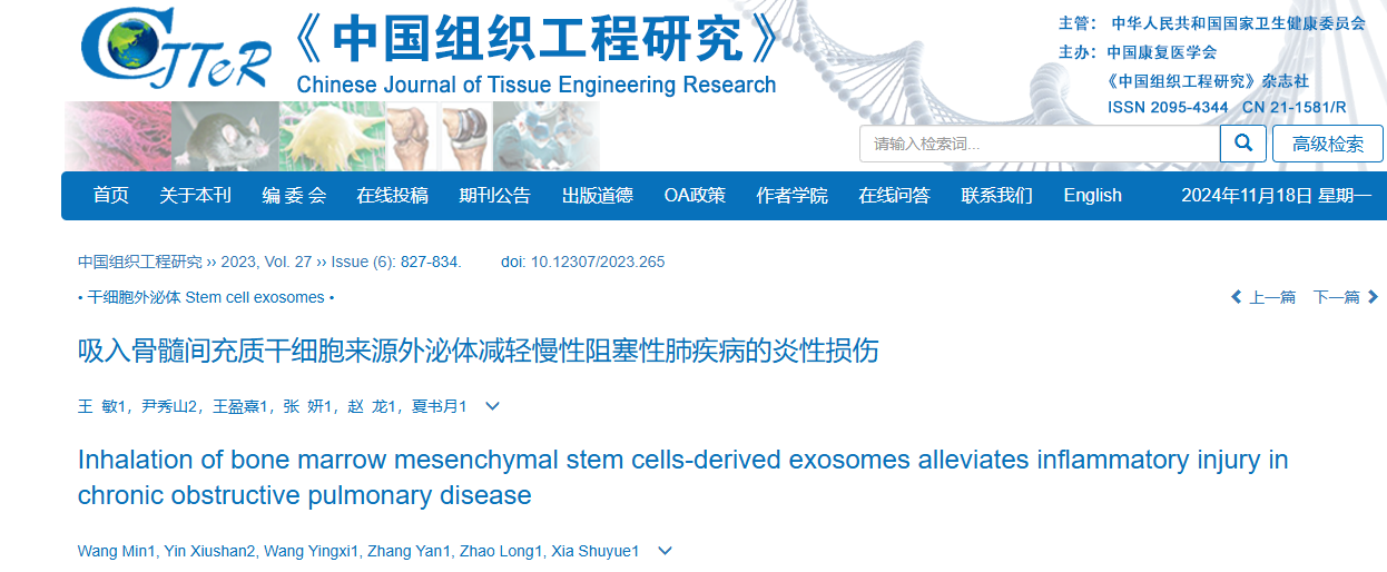 近日,《吸入骨髓間充質干細胞來源外泌體減輕慢性阻塞性肺疾病的炎性損傷》在《中國組織工程研究》上發表。該研究探討了吸入骨髓間充質干細胞來源外泌體對COPD的影響效果。研究結果表明,外泌體在透射電鏡下顯示為橢圓形的雙層膜囊泡結構,霧化間充質干細胞源外泌體可以有效改善脂多糖及香煙煙霧誘導的慢阻肺大鼠模型,使模型大鼠的肺功能、肺局部和全身的炎癥反應、肺組織病理損傷及膠原沉積明顯緩解。