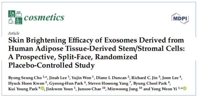 由韓國ExoCoBio外泌體研究所、韓國中央大學醫(yī)學院皮膚科和美國關島皮膚病研究所共同進行的一項試驗,證實了人間充質干細胞來源的外泌體具有體外抗色素沉著作用和體內亮膚功效。相關研究成果發(fā)表在國際學術期刊《Cosmetics》上。
