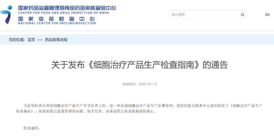 2025年1月13日,國家藥品監(jiān)督管理局食品藥品審核查驗(yàn)中心發(fā)布了《細(xì)胞治療產(chǎn)品生產(chǎn)檢查指南》,為細(xì)胞治療產(chǎn)品生產(chǎn)領(lǐng)域帶來了重要的規(guī)范與指引。