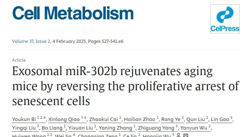 2025年 1月15日,中國科學院生物物理研究所、河南省科學院、上海中醫藥大學博鰲國際醫院等研究團隊在行業期刊Cell Metabolism上發表了題為《Exosomal miR-302b rejuvenates agingmice by reversing the proliferative arrest ofsenescent cells》的研究成果。