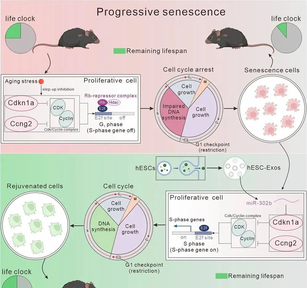 然而,逆轉衰老細胞增殖停滯對延緩衰老的潛在貢獻仍未被探索。此外,越來越多的證據表明,人類胚胎干細胞衍生的外泌體 (hESC-Exos) 在局部組織(如海馬和骨髓)中具有再生和復原作用。