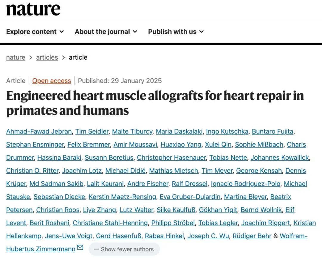 2025年1月,德國哥廷根大學醫(yī)學中心和德國心血管研究中心在《Nature》雜志發(fā)表了一項里程碑式研究。他們使用誘導多能干細胞(iPSC)來源的心肌細胞和基質細胞構建了工程化心肌(EHM)同種異體移植物。