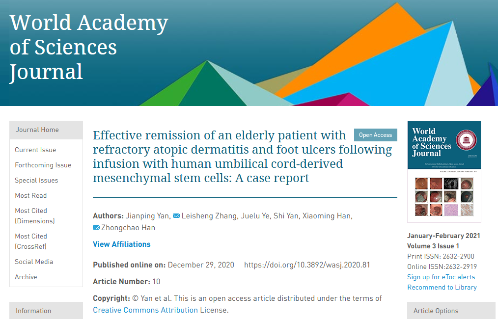2020年12月,英國(guó)著名出版商Spandidos Publications旗下《World Academy of Sciences Journal》發(fā)表了一項(xiàng)間充質(zhì)干細(xì)胞應(yīng)用于特應(yīng)性皮炎案例,這給部分患者帶來(lái)了希望,該研究團(tuán)隊(duì)通過(guò)人臍帶間充質(zhì)干細(xì)胞技術(shù),成功治愈了一名65歲女性難治性特應(yīng)性皮炎合并尿路感染和嚴(yán)重足部潰瘍的患者,研究顯示,干細(xì)胞應(yīng)用后患者睡眠和生活質(zhì)量均顯著改善,后在14個(gè)月的隨訪中未見(jiàn)復(fù)發(fā)和不良反應(yīng)。