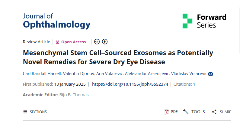 2025年1月,多名作者在期刊《Journal of Ophthalmology》發(fā)布了一篇題為“Mesenchymal Stem Cell-Sourced Exosomes as Potentially Novel Remedies for Severe Dry Eye Disease”(間充質(zhì)干細(xì)胞來源的外泌體有望成為重癥干眼癥的新型治療方案)的綜述文章,其中精選了175篇相關(guān)文獻(xiàn),對間充質(zhì)干細(xì)胞外泌體在治療嚴(yán)重干眼癥方面的機(jī)制進(jìn)行了全面的總結(jié)。