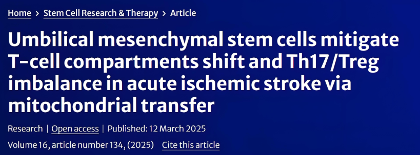 2025年,大連醫(yī)科大學(xué)的陳爽寧教授團隊在《Stem Cell Research&Therapy》雜志發(fā)表的題為《Umbilical mesenchymal stem cells mitigate T-cell compartments shift and Th17/Treg imbalance in acute ischemic stroke via mitochondrial transfer》的研究,更是深入揭示了臍帶間充質(zhì)干細胞(UMSCs)在AIS治療中的關(guān)鍵作用及獨特機制。