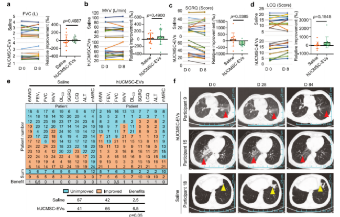 在臨床研究方面,團隊開展的臨床試驗采用隨機、單盲、安慰劑對照設計,共納入24例肺纖維化患者。結果令人欣喜:霧化吸入人臍帶間充質干細胞來源外泌體治療肺纖維化安全性良好,沒有出現嚴重不良事件。與僅接受常規藥物治療的對照組相比,接受聯合治療(藥物治療和外泌體霧化治療)的患者在肺功能和呼吸健康狀態方面均有顯著改善。其中,2例肺炎引起的肺纖維化患者在治療后,影像學檢查顯示病灶顯著好轉。