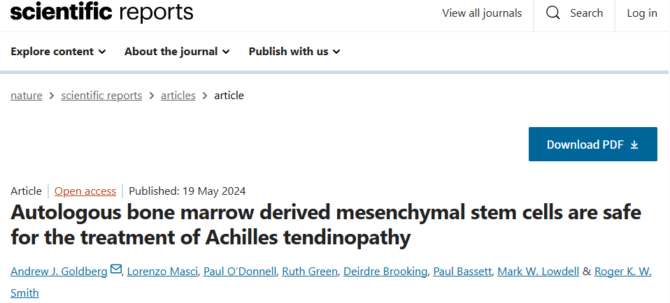 《Autologous Bone Marrow Derived Mesenchymal Stem Cells Are Safe for the Treatment of Achilles Tendinopathy》該研究報道了應(yīng)用自體骨髓間充質(zhì)干細(xì)胞治療跟腱病的安全性,研究中其中一名右跟腱中段存在病理性改變,且有顯著后跟疼痛的44歲男性,在應(yīng)用自體骨髓間充質(zhì)干細(xì)胞后,疼痛評分顯著降低,跟腱功能指數(shù)顯著提高,超聲和磁共振檢查顯示肌腱愈合良好,且未發(fā)生感染、神經(jīng)損傷等并發(fā)癥,表明自體骨髓間充質(zhì)干細(xì)胞治療跟腱病是有效的。