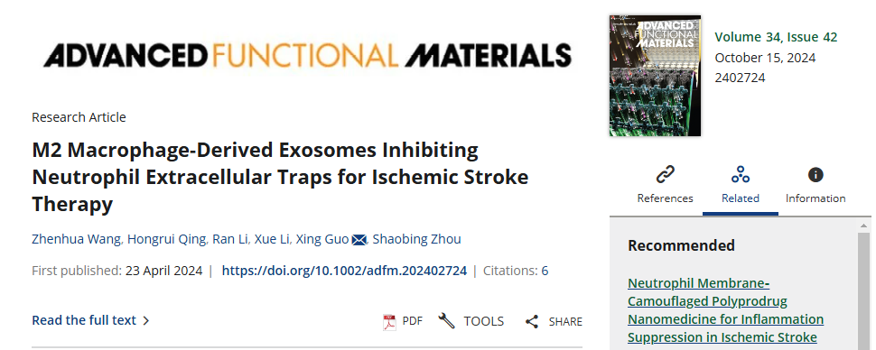 缺血性卒中的協同治療:西南交通大學郭星/周紹兵教授團隊在《Advanced Functional Materials》發表研究,開發了CD206+ M2樣巨噬細胞衍生外泌體搭載DNase 1的治療系統。該系統通過外泌體的胞吞作用穿過血腦屏障,清除NETs的同時誘導小膠質細胞M2極化,顯著減少腦梗死面積并改善神經功能。