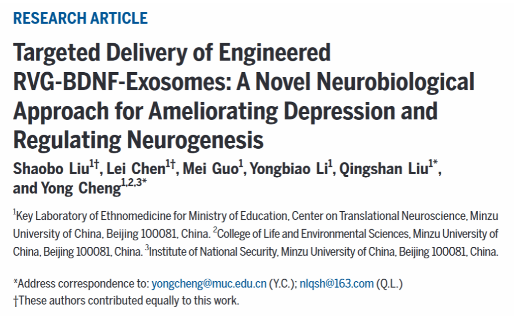 抑郁癥的基因治療突破:中央民族大學程勇教授團隊在《Research》發表創新研究,開發了 RVG-BDNF工程化外泌體。通過基因工程技術將神經元特異性狂犬病毒糖蛋白(RVG)和BDNF基因結合,創造出能靶向神經元的外泌體。經尾靜脈注射后,這些“特洛伊木馬”有效改善小鼠抑郁樣行為,增加海馬和前額葉皮層區域的成熟神經元數量。
