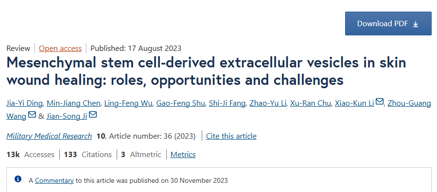 南方醫科大學南方醫院整形美容科團隊在《Journal of Translational Medicine》(2025)上發表的系統綜述(納入83項研究)表明,間充質干細胞來源外泌體(MSC-EVs)有以下效果:
