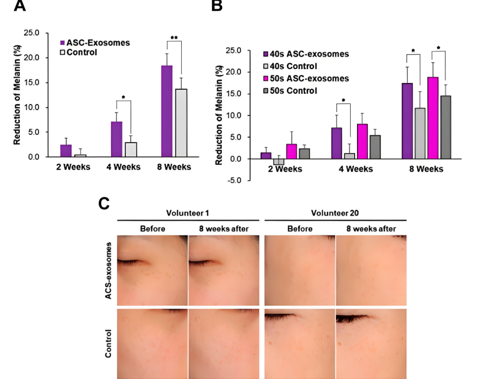 首爾國立大學的《Skin Brightening Efficacy of Exosomes Derived from Human Adipose Tissue-Derived Stem/Stromal Cells: A Prospective,Split-Face,Randomized Placebo-Controlled Study》隨機對照研究證實,脂肪間充質干細胞外泌體(ADSC-Exo)具有亮膚效果。應用4周后,受試者黑色素水平降低,且未觀察到不良反應。