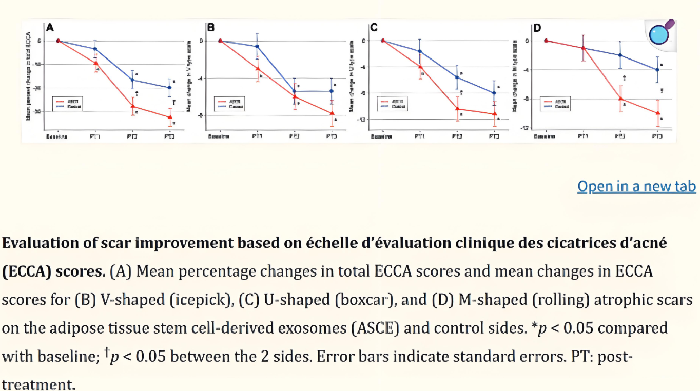 發表于《Acta Dermato-Venereologica》的一項前瞻性雙盲自身對照研究(納入25名中重度萎縮性痤瘡疤痕患者)發現,將干細胞外泌體與點陣二氧化碳激光聯合應用,其疤痕改善效果顯著優于單獨使用激光。