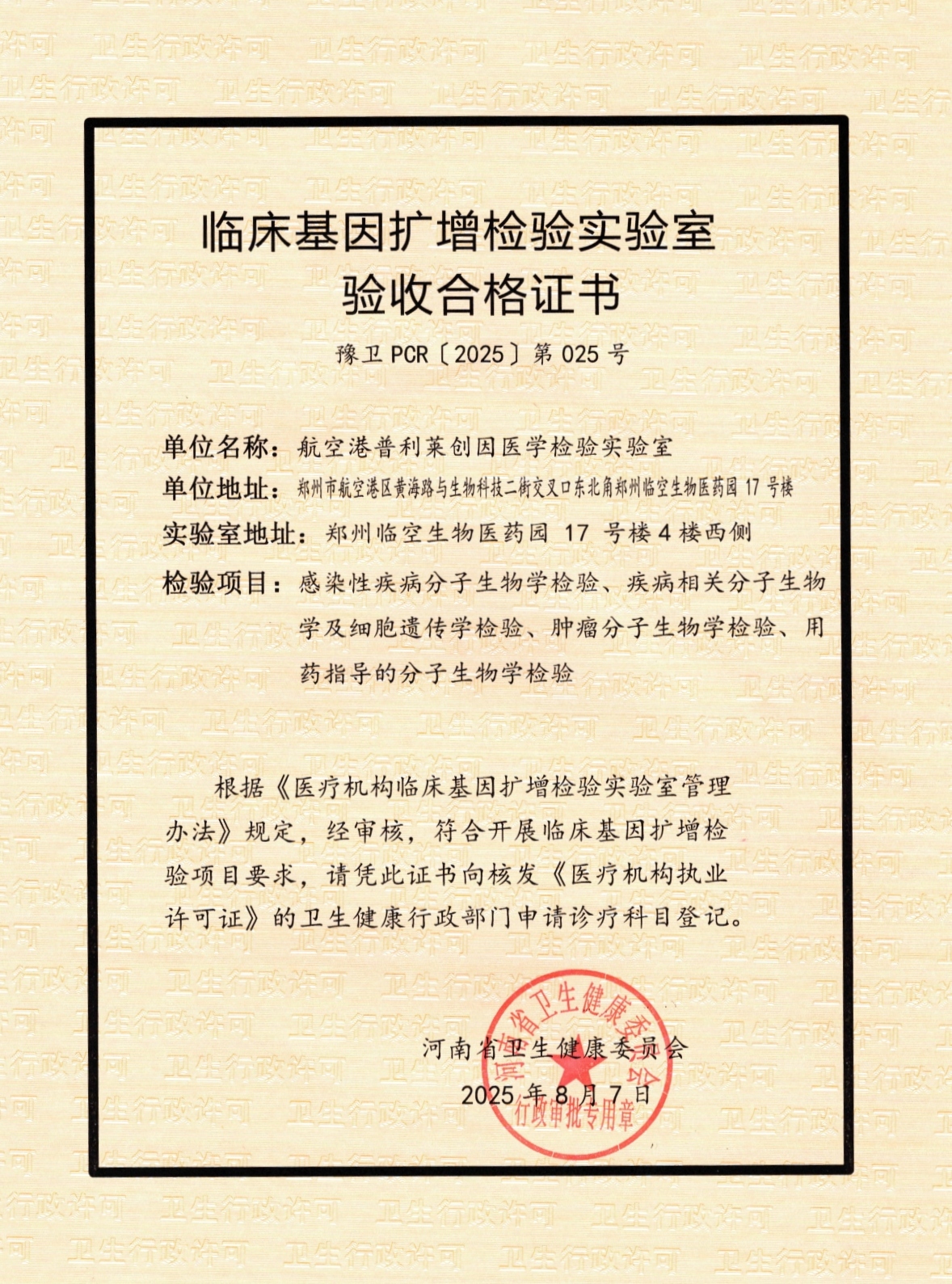2025年3月14日,航空港普利萊創因醫學檢驗實驗室已取得《醫療機構執業許可證》,其硬件設施、技術實力及規范化管理獲得官方權威認可。此次臨床基因擴增檢驗實驗室驗收的順利通過,更進一步驗證了實驗室在分子診斷領域的技術優勢。目前,實驗室已具備開展感染性疾病分子生物學檢驗、疾病相關分子生物學及細胞遺傳學檢驗、腫瘤分子生物學檢驗、用藥指導的分子生物學檢驗四大核心檢測項目的能力,覆蓋從疾病篩查、精準診斷到個性化用藥指導的全流程服務。