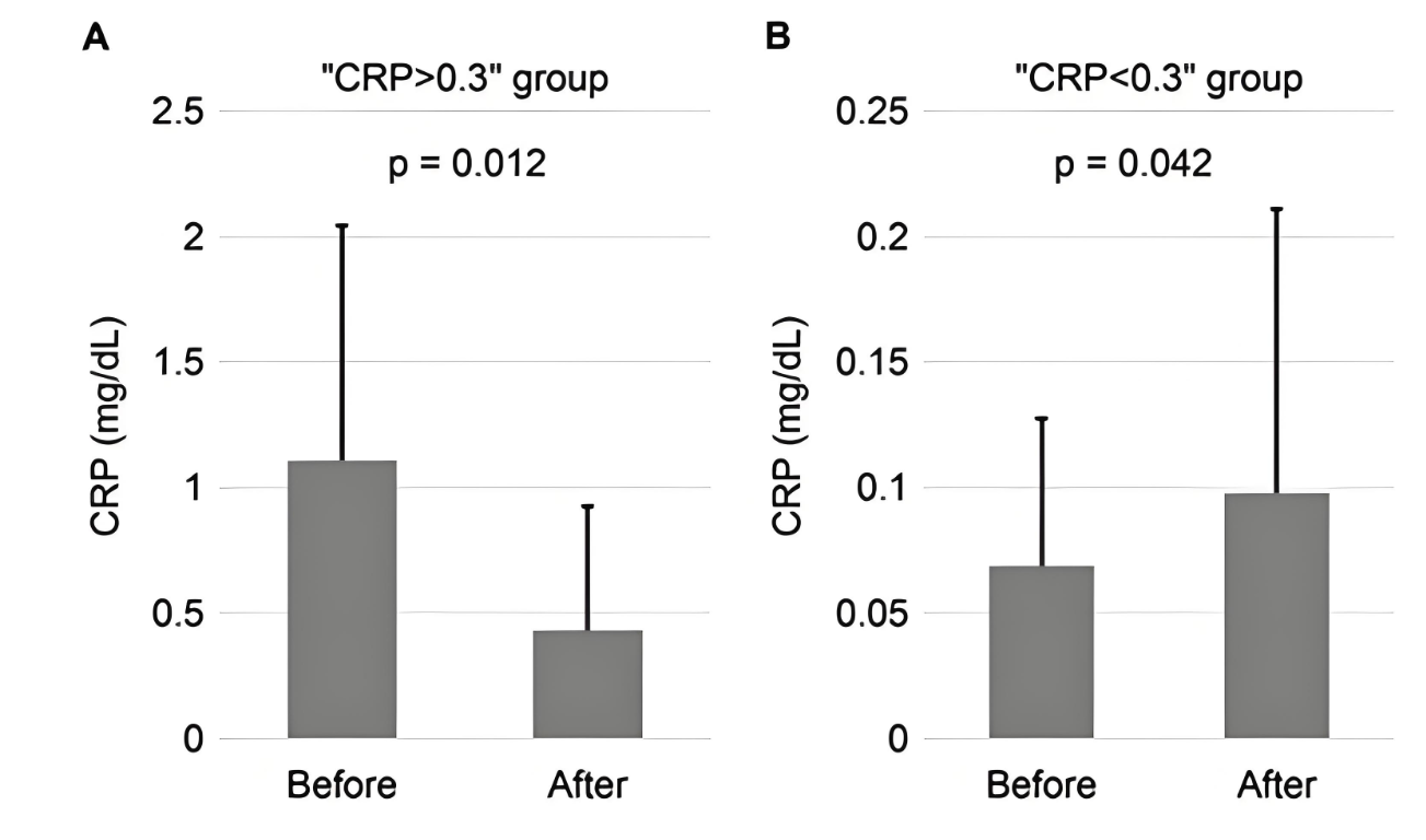 特別在基線CRP > 0.3 mg/dL(已存在炎癥狀態)的患者中,CRP下降趨勢顯著。