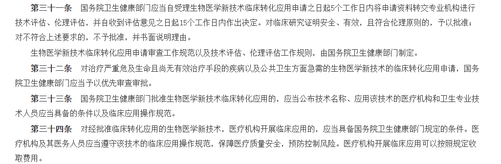 《條例》首次以行政法規形式明確生物醫學新技術的定義:“以對健康狀態作出判斷或者預防治療疾病、促進健康為目的,運用生物學原理,作用于人體細胞、分子水平,在我國境內尚未應用于臨床的醫學專業手段和措施”。