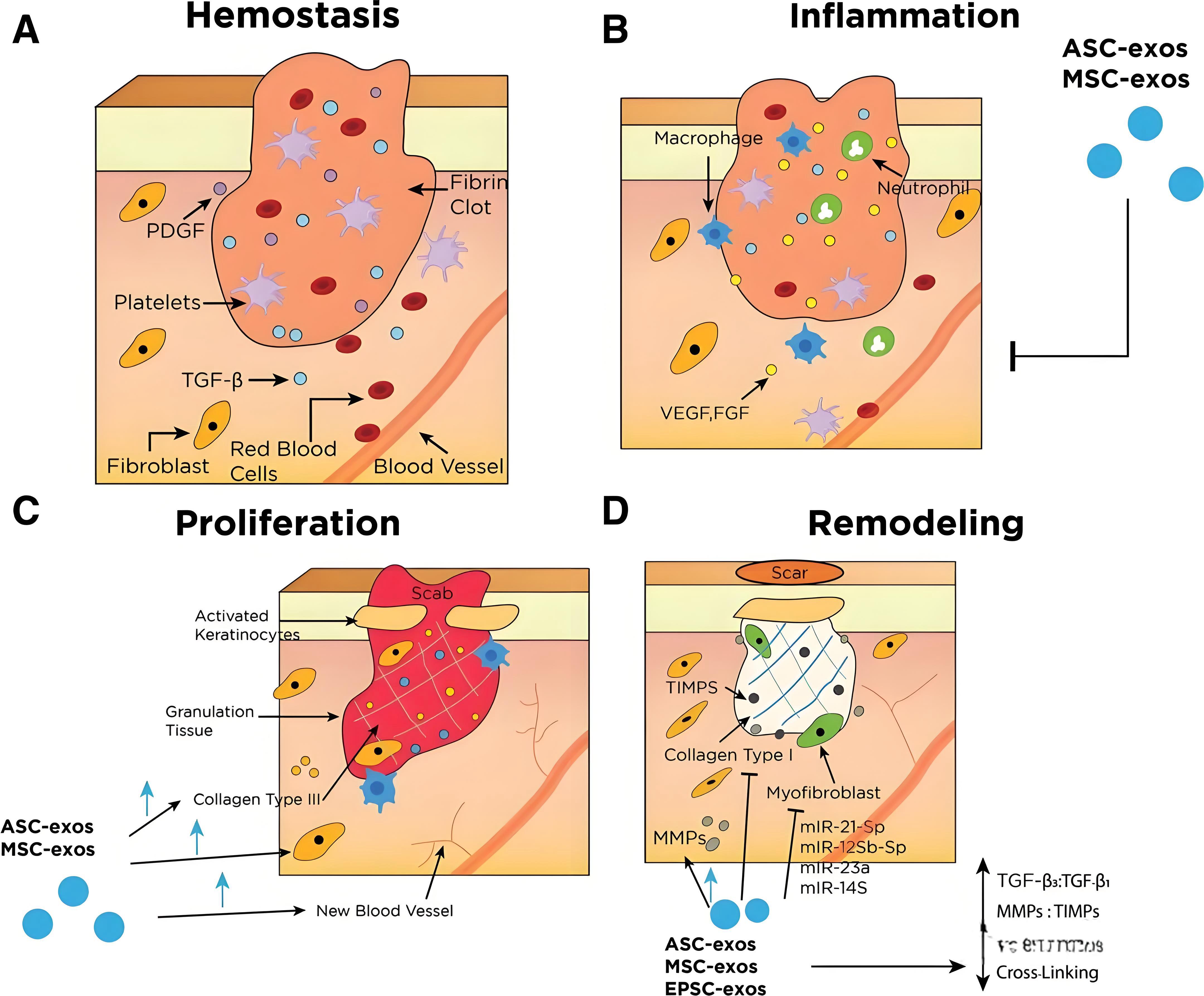 不理想的疤痕類型包括萎縮性、寬大性、肥厚性及瘢痕疙瘩等。目前修復方式多樣,但效果因人而異。有研究探討外泌體在調節疤痕形成與促進皮膚再生方面的潛力。外泌體可參與傷口愈合的多個階段,通過影響相關細胞與信號分子,調節愈合進程與組織重建。