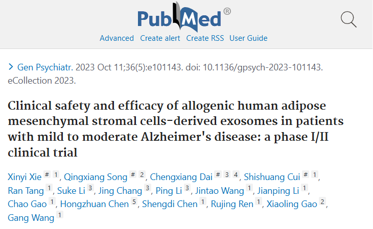 2023年,上海交通大學醫(yī)學院附屬瑞金醫(yī)院等機構共同完成一項開放標簽的I/II期臨床試驗(NCT04388982),首次評估了人源脂肪間充質干細胞外泌體經鼻腔給藥治療輕中度阿爾茨海默病的安全性及初步療效。