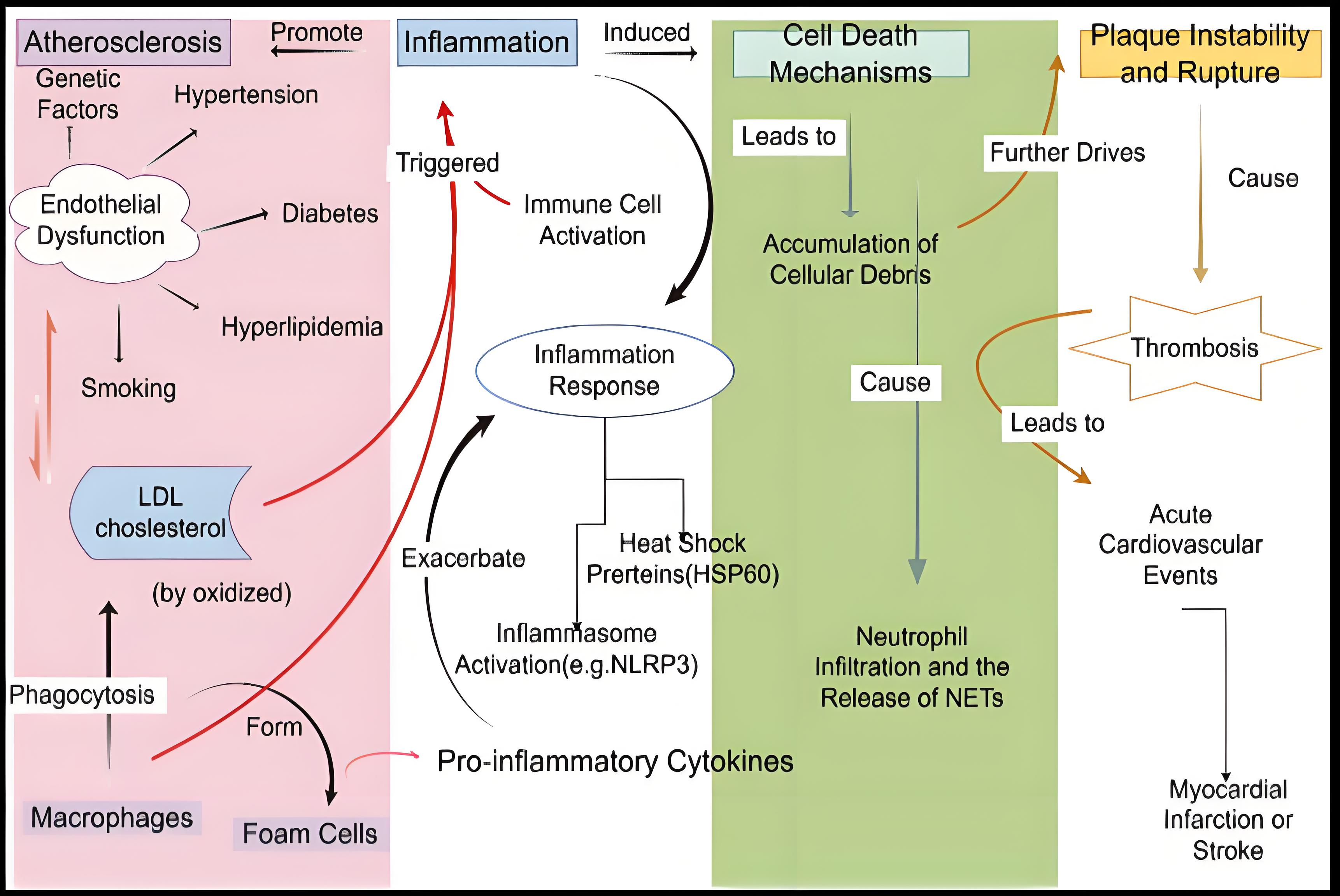 動脈粥樣硬化是心肌梗死的主要病因。其病理特征為動脈內脂質、膽固醇等物質沉積形成斑塊,造成血管壁增厚、變硬和管腔狹窄。斑塊破裂可誘發血栓形成,導致血管急性堵塞,引發心肌梗死或腦卒中。