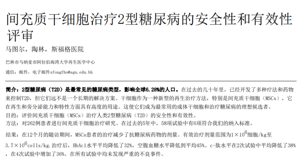 根據(jù)研究試驗(yàn),使用間充質(zhì)干細(xì)胞干預(yù)Ⅱ型糖尿病,胰島素抵抗和胰島素依賴性減少。此外,HbAc1和FBG水平的顯著降低提示肝功能得到改善。這些試驗(yàn)還顯示,在2個(gè)試驗(yàn)(T1和T4)中,c肽水平下降到正常水平,這表明體內(nèi)負(fù)責(zé)胰島素抵抗的胰島細(xì)胞有所改善。其他四個(gè)試驗(yàn)(T2、T3、T4和T5)顯示c肽水平升高。