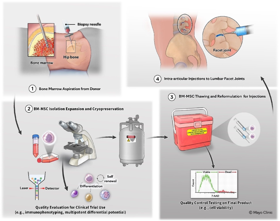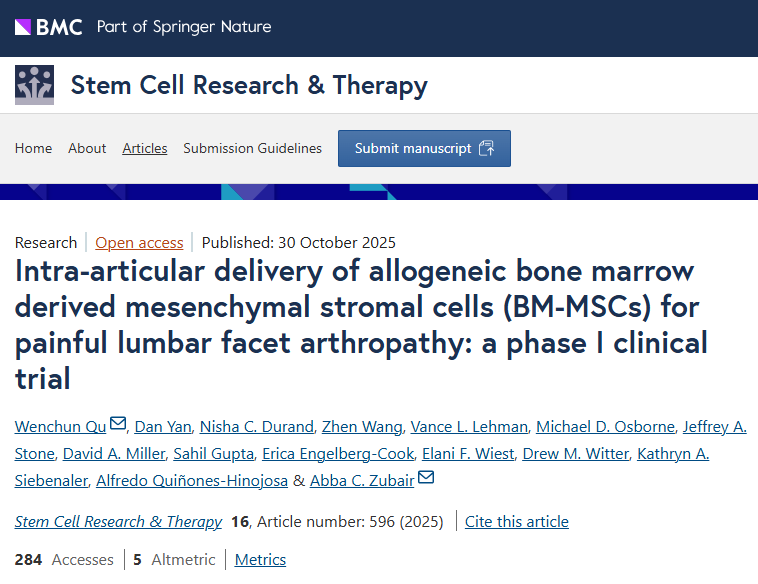 近期,美國佛羅里達州杰克遜維爾市的梅奧診所完成了一項關于“關節內注射異體骨髓間充質干細胞(BM-MSCs)治療疼痛性腰椎小關節病”的I期臨床試驗,相關結果已在國際期刊《Stem Cell Research & Therapy》上發表。該研究初步證實,關節內注射BM-MSCs干預LFA具有良好的安全性與潛在療效。