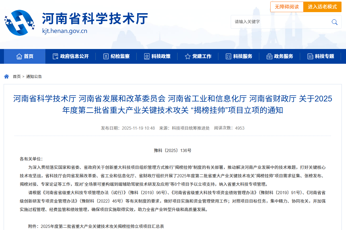 (圖為河南省科技廳關(guān)于2025年度第二批省重大產(chǎn)業(yè)關(guān)鍵技術(shù)攻關(guān)“揭榜掛帥”項(xiàng)目立項(xiàng)的通知)