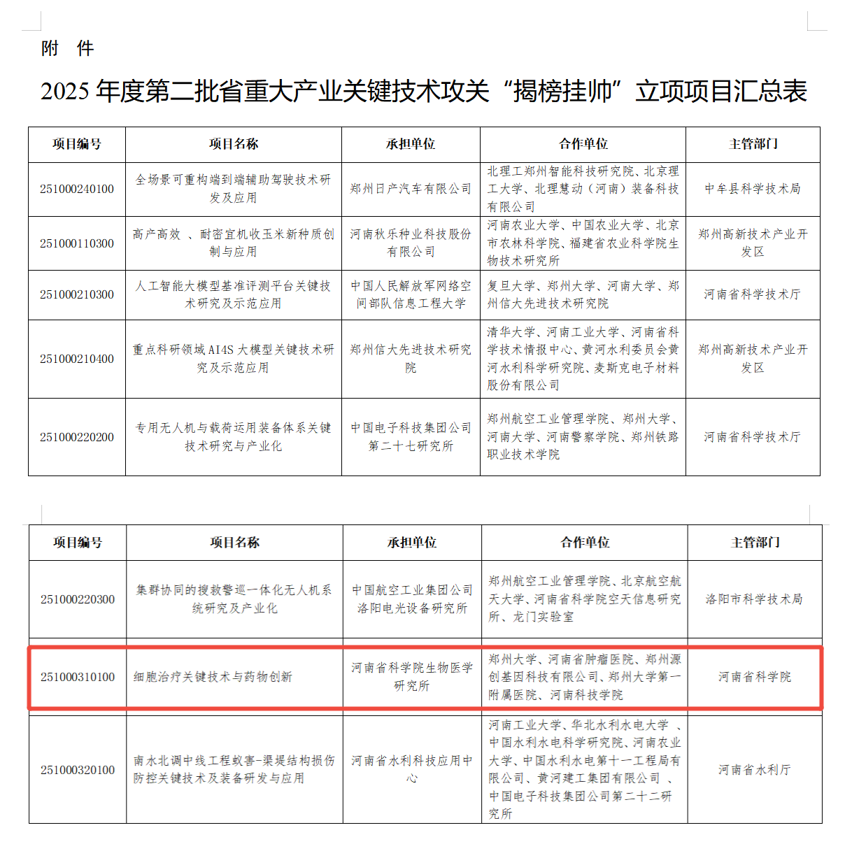 近日,河南省科學(xué)技術(shù)廳正式公布2025年度第二批省重大產(chǎn)業(yè)關(guān)鍵技術(shù)攻關(guān)“揭榜掛帥”立項(xiàng)項(xiàng)目名單,由河南省科學(xué)院生物醫(yī)學(xué)研究所牽頭,聯(lián)合鄭州大學(xué)、河南省腫瘤醫(yī)院、鄭州源創(chuàng)基因科技有限公司、鄭州大學(xué)第一附屬醫(yī)院、河南科技學(xué)院共同發(fā)起的“細(xì)胞治療關(guān)鍵技術(shù)與藥物創(chuàng)新”項(xiàng)目成功入選!作為項(xiàng)目唯一企業(yè)參與方,源創(chuàng)基因?qū)⑸疃葏f(xié)同攻關(guān),以優(yōu)秀科研實(shí)力助力河南生物醫(yī)藥產(chǎn)業(yè)創(chuàng)新突破。