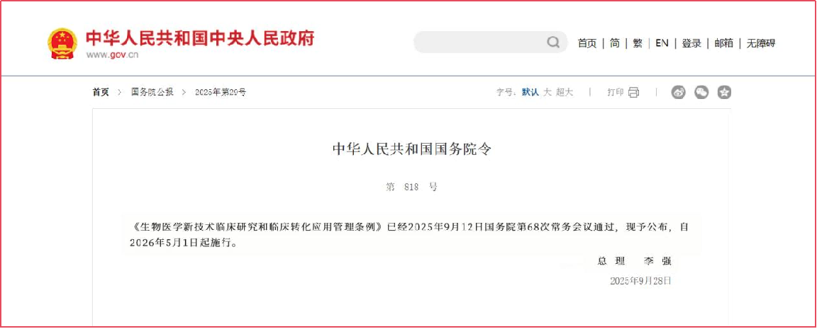 (圖為國務院2025年第818號令關于《生物醫學新技術臨床研究和臨床轉化應用管理條例》政策發布截圖)