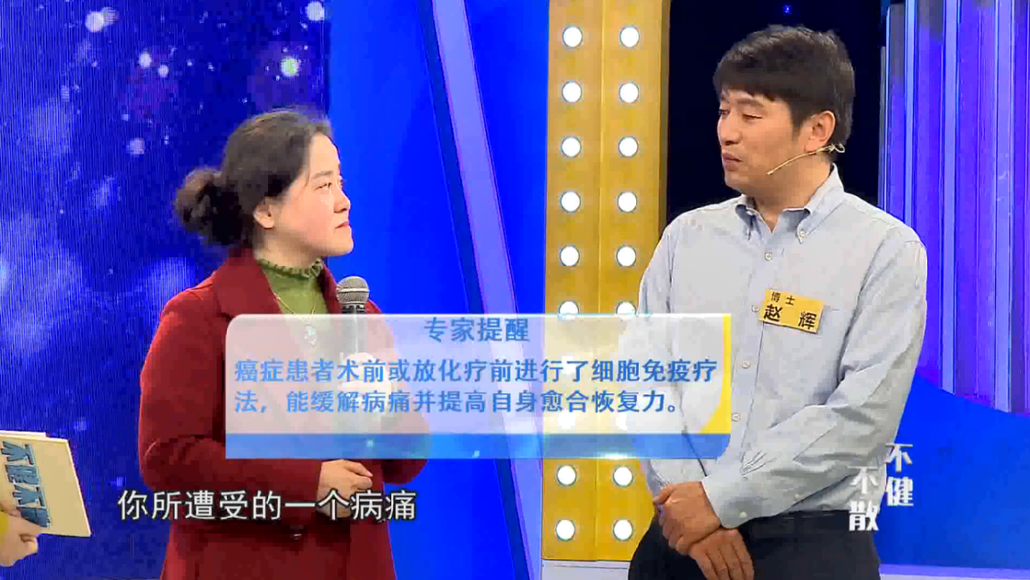 (圖為重慶電視臺《不健不散》健康欄目專訪現場,源創基因董事長趙輝博士詢問腫瘤患者鄭女士使用細胞后身體狀況)
